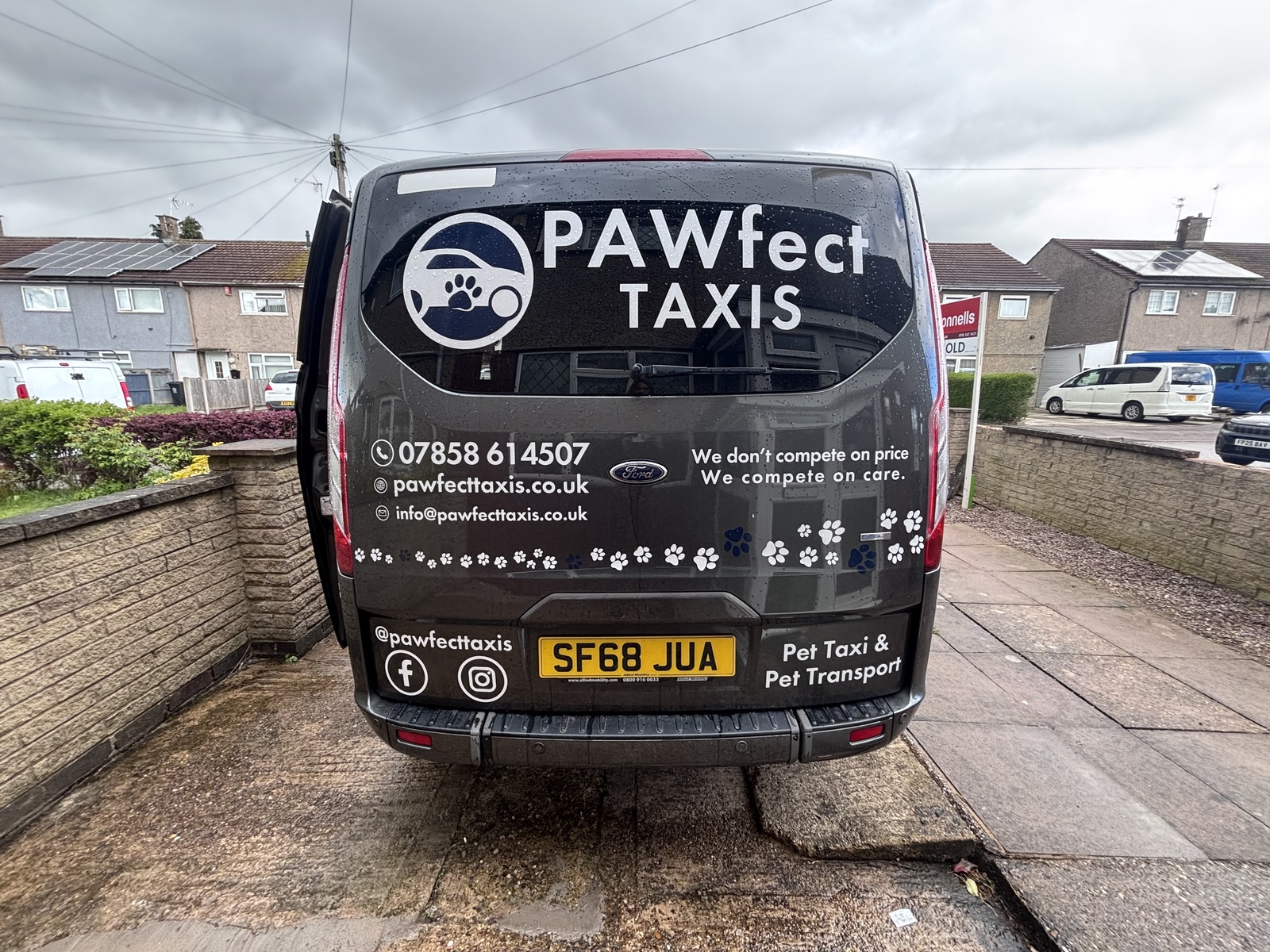 Our Ford Tourneo Custom is clearly branded as PAWfect TAXIS, making it easy for customers to recognise on arrival. This helps build trust, adds professionalism, and reassures owners that their pet is travelling with a genuine dedicated pet transport service.